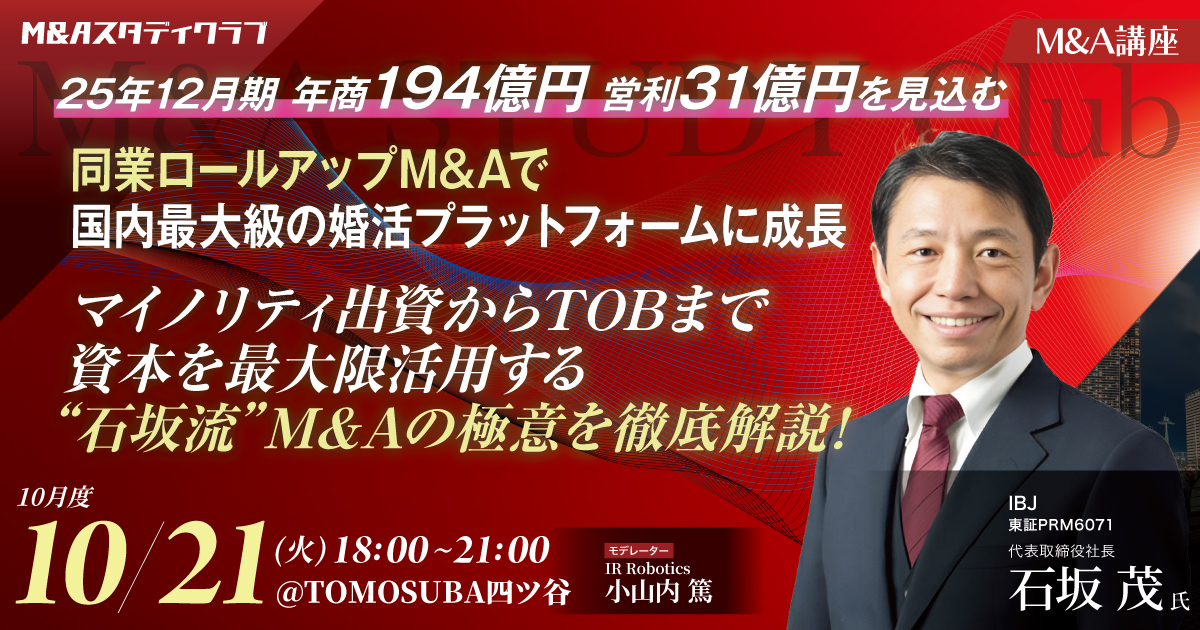 25年12月期 年商194億円 営利31億円を見込む 同業ロールアップM&Aで国内最大級の婚活プラットフォームに成長 マイノリティ出資からTOBまで資本を最大活用する”石坂流”M&Aの極意を徹底解説!